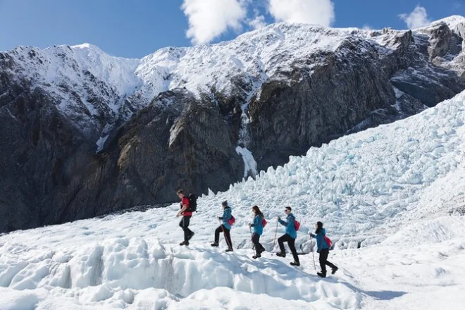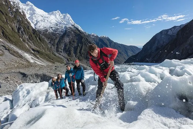 Envolez-vous en hélico directement sur le glacier Franz Josef, puis randonnez sur la glace bleue mouvante avec un guide expert qui partage histoires locales et faits sur la glaciologie. Enfilez vos crampons, traversez des couloirs glacés, et arrêtez-vous là où la lumière transforme tout en bleu surréaliste. Équipement complet et vols aller-retour inclus — ce souvenir vous marquera longtemps après que vos chaussures soient sèches.