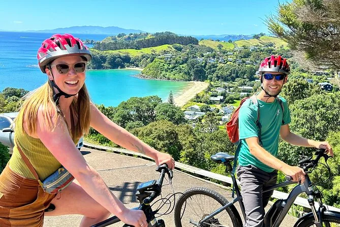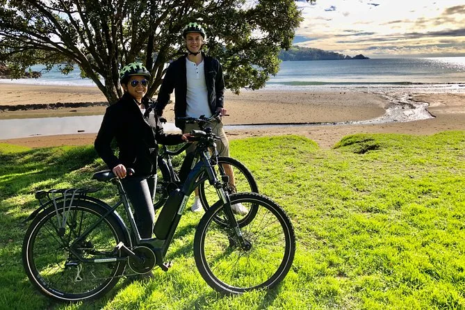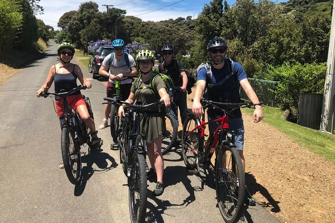 Votre journée comprend un vélo électrique confortable, un casque pour la sécurité, un antivol robuste pour vos arrêts, une sacoche pour vos affaires, un support téléphone pour utiliser Google Maps en roulant (croyez-moi), ainsi qu’une carte locale annotée par des pros qui connaissent tous les raccourcis — et tout commence au terminal ferry de Matiatia Bay, pour embarquer direct dans l’aventure.