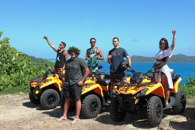 Votre journée combine un tour en quad et une balade en jet ski guidés par des locaux qui racontent des histoires en chemin ; arrêts aux canons de la Seconde Guerre et points de vue, pauses avec eau de coco glacée et fruits tropicaux, avant un déjeuner BBQ polynésien complet avec boissons sur un motu, puis retour.