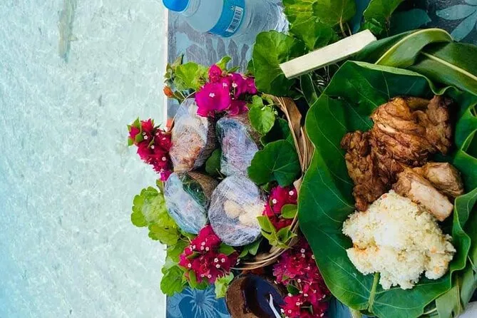Le déjeuner comprend poisson et poulet grillés, salade de riz, poisson cru, poe (dessert), uru (fruit à pain), taro, ipo (pain sucré), jus Rotui et fruits de saison.