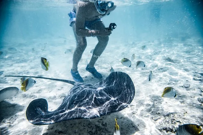Votre journée comprend la prise en charge à l’hôtel ou au port à Bora Bora, tout le matériel de snorkeling pour ne rien avoir à apporter, un déjeuner barbecue préparé par des locaux sur un motu privé (avec beaucoup de fruits frais), ainsi que les conseils d’un expert qui connaît chaque recoin du lagon avant de vous ramener confortablement au coucher du soleil.