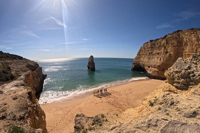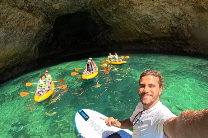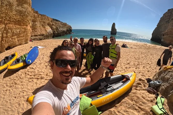 Pagayez depuis la plage de Carvalho en petit groupe avec un guide local, explorez falaises calcaires et grottes secrètes avant d’atteindre la grotte de Benagil pour des photos 4K offertes. Au programme : rires, eau fraîche, histoires sur la géologie et les oiseaux, et détente sur le sable.