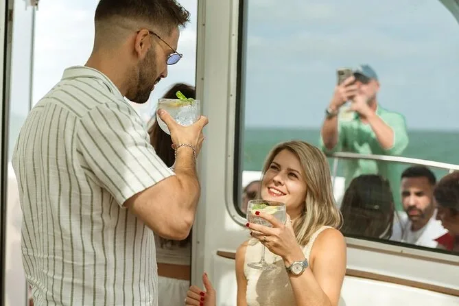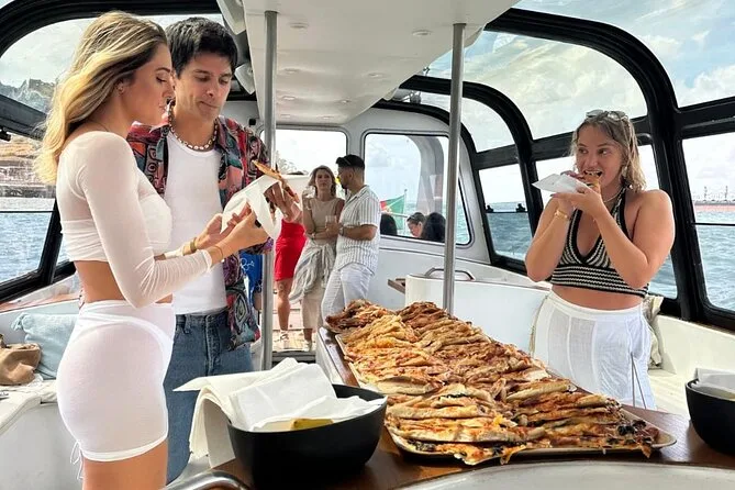 Votre soirée comprend une croisière de luxe au coucher du soleil sur le Tage à Lisbonne avec sangria à volonté, open bar (vin blanc ou rosé, bière, sodas comme Fanta ou Coca, eau et café), buffet de pizzas fraîches, le tout rythmé par un DJ live pendant que vous passez devant les monuments de la ville avant de revenir à quai.