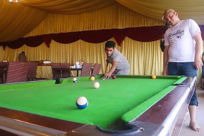 Finalement, on est arrivés au camp désertique Al Rahal. L’odeur de la viande grillée nous a accueillis—la fumée du BBQ flottant près des transats et des coussins majlis sous de grandes tentes. Le repas (déjeuner ou dîner selon l’heure) est en buffet; j’ai chargé mon assiette de kebab d’agneau et de riz, puis je me suis installé avec un thé sucré pendant que des enfants jouaient au foot à côté. On a le temps de flâner ou juste de s’étendre en regardant la lumière changer sur les dunes. Si vous avez la chance de passer la nuit (j’aurais aimé), ils proposent des chambres privées avec salles de bain—pas ce à quoi je m’attendais ici au milieu du désert.