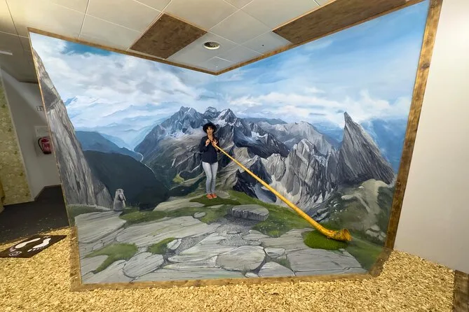 La première chose que j’ai vue, c’était cette explosion de couleurs à travers la vitre—comme si quelqu’un avait vidé toutes les boîtes de crayons de Suisse sur les murs. On venait juste de s’abriter de la petite pluie (le temps typique d’Interlaken, franchement), et soudain, on se retrouvait dans le Swiss Selfie Museum, les chaussures qui crissaient sur le sol lisse. Un groupe d’ados riait près d’une énorme vache peinte—une de ces fresques 3D qui semble prête à sortir de la photo. Notre guide, Lara, nous a fait signe et a parlé de « trouver notre passion pour le fromage », ce qui m’a fait éclater de rire. Je ne suis pas sûre d’avoir trouvé la mienne, mais j’ai quand même pris une photo avec une montagne faite entièrement de barres de chocolat peintes.