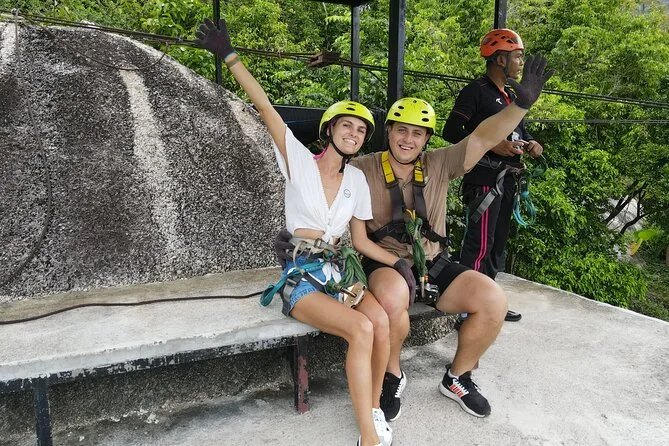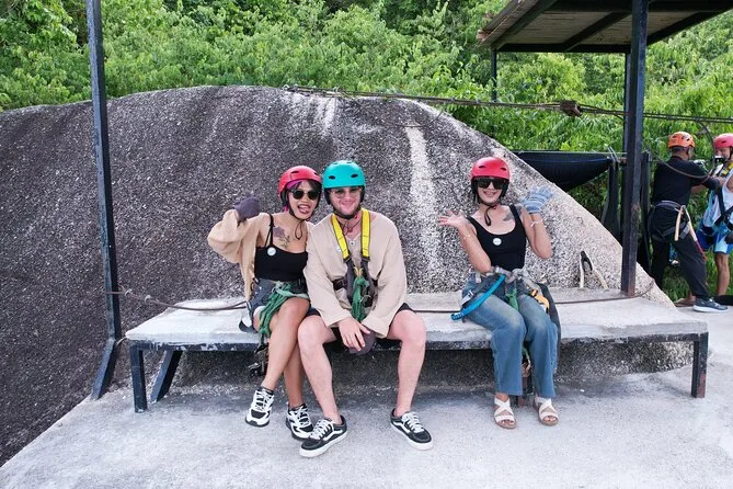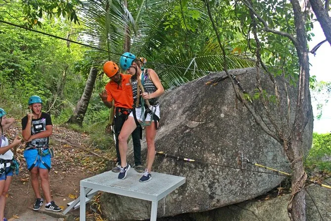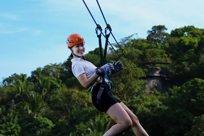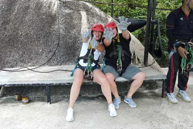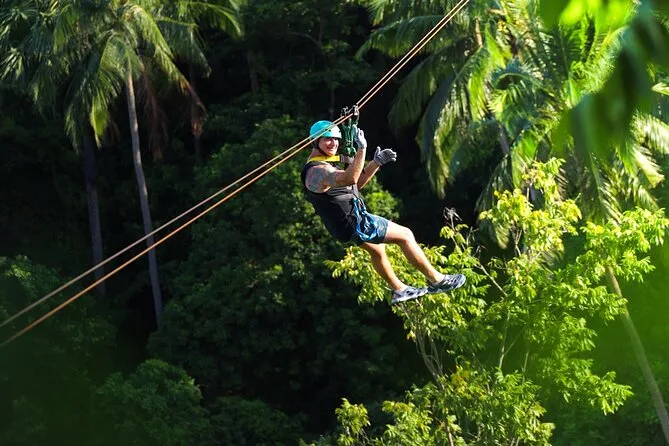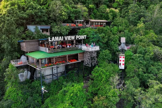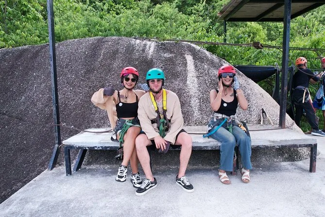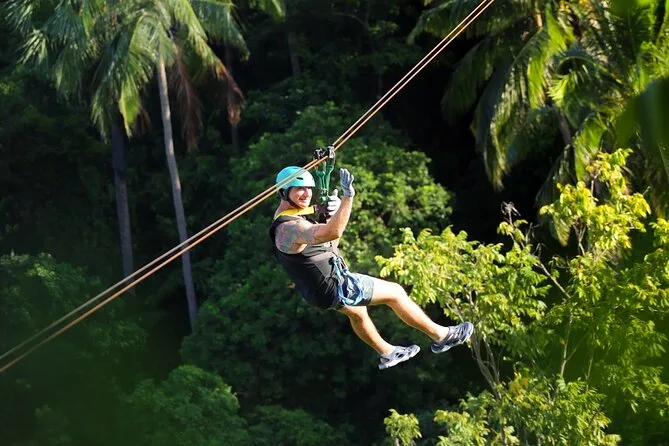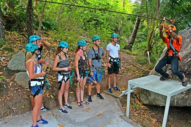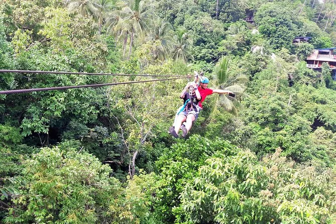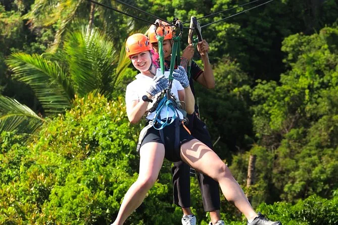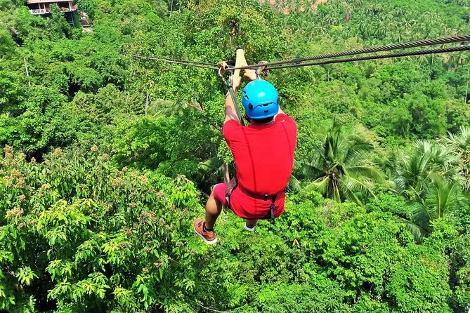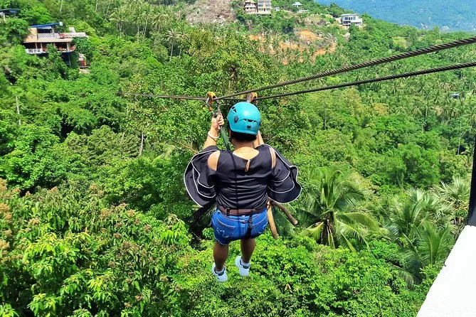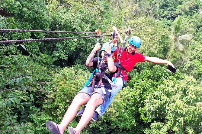 Montez en téléphérique sur la colline de Lamai, puis survolez les palmiers en tyrolienne avec une vue imprenable sur la côte de Koh Samui. Ensuite, détendez-vous au bar panoramique ou testez un massage fish spa près de Valentine Stone. Rires, saveurs locales et souvenirs inoubliables garantis.