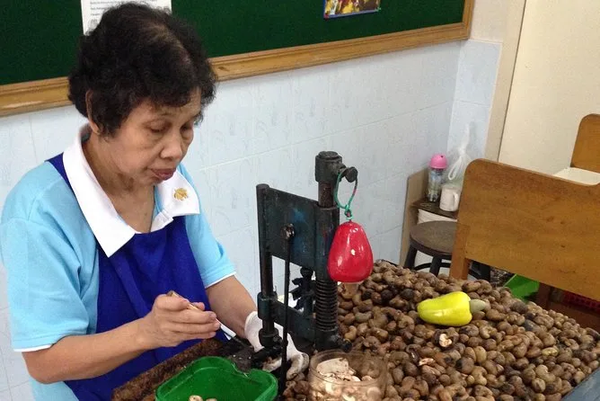 Vous dégusterez des noix de cajou fraîches pendant la visite de l’usine ; d’autres pauses gourmandes ne sont pas prévues, mais vous croiserez des vendeurs ambulants en chemin.