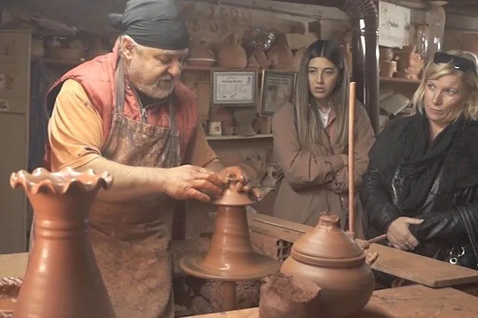 Le déjeuner à Avanos était sous forme de buffet : mezzés, légumes grillés, ragoût d’agneau pour ceux qui voulaient. Le pain était chaud et moelleux ; j’ai peut-être un peu trop mangé. Puis, on s’est glissés dans un atelier de poterie creusé juste sous la rue. Le potier tournait l’argile du fleuve Kızılırmak avec une maîtrise impressionnante – il souriait en travaillant, puis nous a laissé essayer (mon pot était un peu bancal, mais bon). L’atelier sentait la terre et un peu la fumée du four.