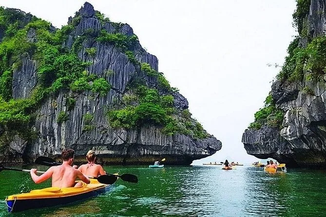 Le déjeuner est arrivé vite — de grandes assiettes de poisson grillé et de riz gluant, avec des options végétariennes pour mon amie allergique aux fruits de mer (ils ont géré ça sans problème). Minh nous a parlé des pêcheurs qui vivent encore dans des maisons flottantes ici. Plus tard, on a jeté l’ancre près de l’îlot Ba Trai Dao pour faire du kayak ; je cognais souvent ma pagaie contre celle de mon partenaire, mais on riait tellement qu’on ne faisait pas vraiment attention à la direction. Il y a eu un moment où j’ai juste arrêté de pagayer pour me laisser dériver — tout ce qu’on entendait, c’était le chant lointain des oiseaux et le clapotis de l’eau contre les rochers. C’est ce souvenir qui m’est resté le plus.