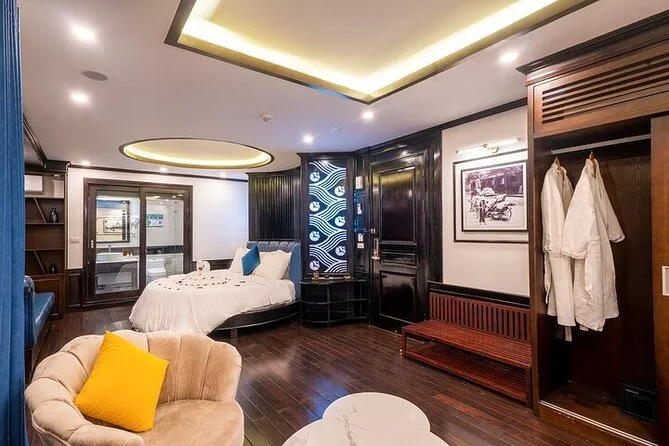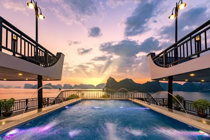 Votre journée comprend le transfert aller-retour Hanoi - baie d’Halong en navette express, les entrées pour tous les sites dont l’île Ti Top et la grotte Sung Sot, le matériel de kayak et les balades en bateau de bambou dans les grottes de Lan Ha, du temps libre pour nager ou bronzer, des ateliers cuisine animés par des chefs locaux (avec rouleaux de printemps !), des repas complets avec fruits de mer ou options végétariennes, une happy hour avec jus ou vin au coucher du soleil, des animations en soirée comme la pêche au calmar ou des jeux de cartes à bord — et votre cabine privée climatisée pour une nuit paisible sur la baie.