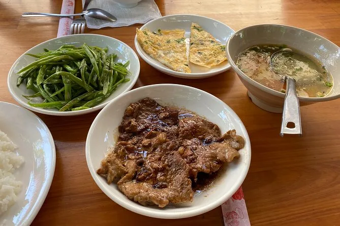 Après avoir déambulé dans My Son (j’ai perdu le compte des tours), Minh nous a conduits chez une famille locale pour le déjeuner. La cuisine embaumait l’ail et le porc caramélisé — j’ai essayé d’aider à mettre la table mais j’étais surtout un obstacle. La famille nous a servi du porc braisé, des haricots verts à l’ail, un œuf frit, une soupe aux champignons… tout avait ce goût simple et réconfortant. Minh a ri quand j’ai essayé de dire « cam on » correctement ; j’ai dû massacrer la prononciation. On est restés un bon moment, bien plus longtemps que prévu — personne n’était pressé.