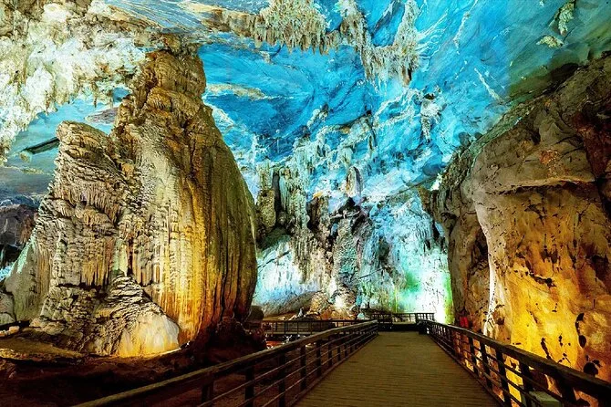 Vous traverserez une jungle luxuriante jusqu’à la Grotte Paradis, marcherez sur des passerelles en bois sous d’anciennes arches calcaires, partagerez un déjeuner avec d’autres voyageurs dans le village de Phong Nha, puis naviguerez en bateau dragon vers les salles illuminées de la grotte de Phong Nha. Attendez-vous à rire avec votre guide et à vivre des instants de silence où la nature souterraine vous fait sentir tout petit.