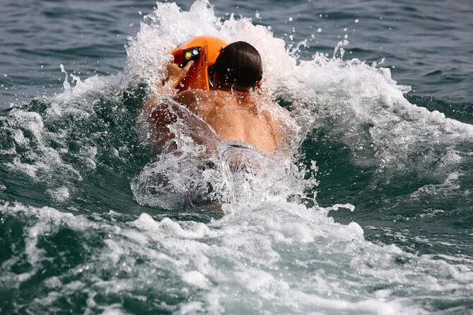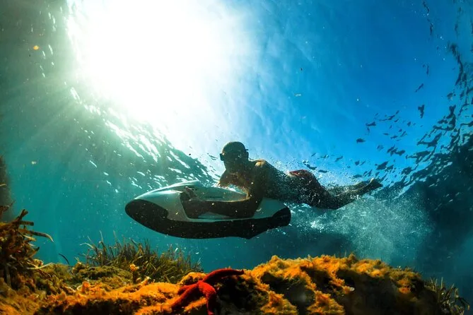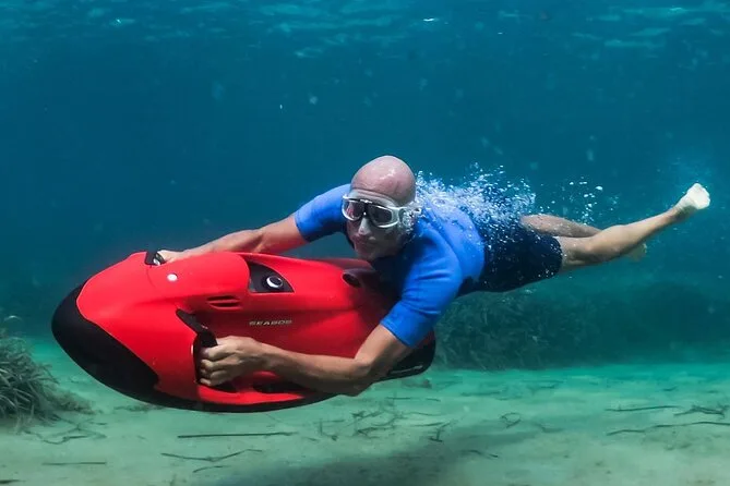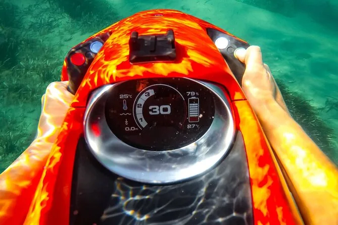 Your experience includes use of an electric underwater scooter plus snorkelling equipment for your session; you'll be guided by locals throughout your time in the water before returning to shore after about half an hour of aquatic play.