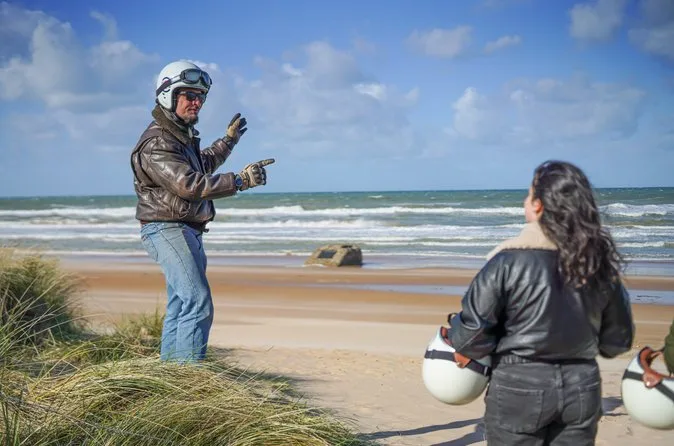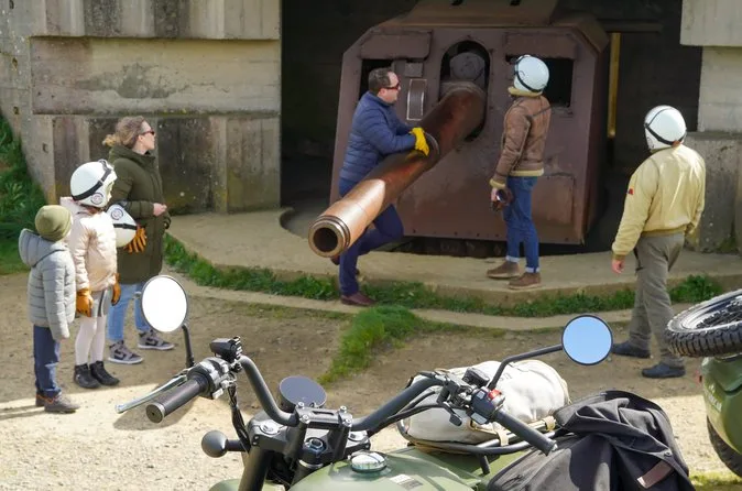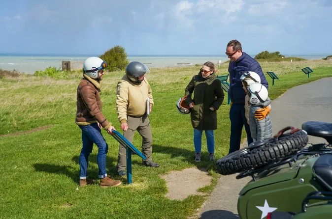 Your day includes pickup from your hotel or meeting point in Bayeux or nearby towns, all necessary gear like helmets, gloves, rain protection and vintage goggles for riding comfort, plus anecdotes from your local “Gentleman Sider” guide as you visit iconic D-Day locations such as Omaha Beach, Pointe du Hoc (for longer tours), Longues-sur-Mer battery and time at memorials before returning through Normandy countryside.