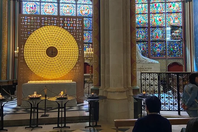 Inside was quieter than I expected — not silent, but kind of hushed in a way that made you lower your voice without thinking. The stained glass glowed blue and red across everyone’s faces. I tried to imagine Napoleon standing here for his coronation (Camille said he put his own crown on — classic Napoleon). There’s this smell inside too: waxy candles mixed with something older, maybe wood polish or just centuries of prayers. We had time to wander after the guided part ended; I found myself sitting for a minute longer than planned, just watching light shift across the floor tiles.