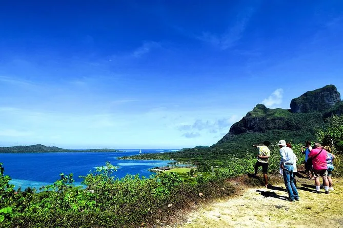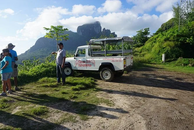 Your day includes hotel or port pickup and drop-off around Bora Bora, all guided transport by open-sided 4WD vehicle and boat, visits to scenic lookouts and local craft workshops, fresh fruit tastings at a plantation stop, use of snorkel equipment (except fins) for swimming with rays and sharks in Coral Gardens’ lagoon waters, plus free time for lunch between land and sea adventures before returning late afternoon.
