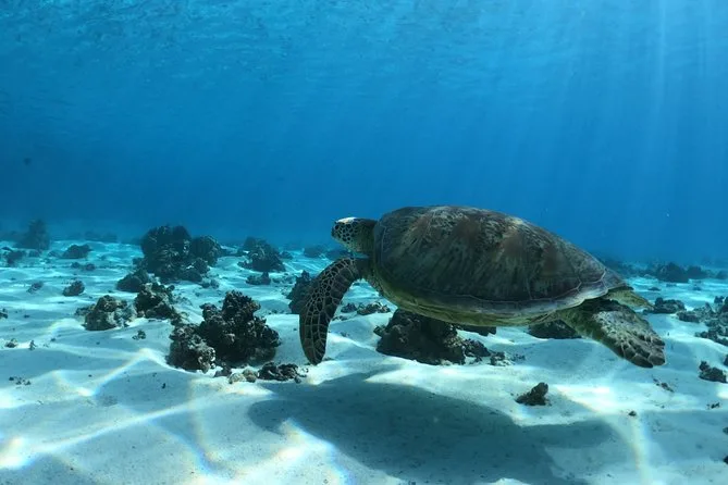 You may encounter green turtles, eagle rays, sharks, whip rays, colorful fish, coral gardens and underwater Tikis.