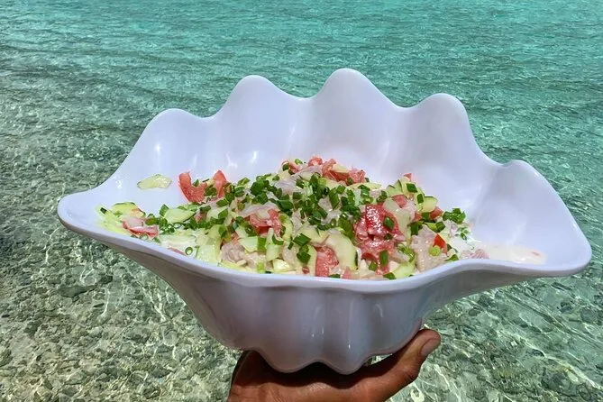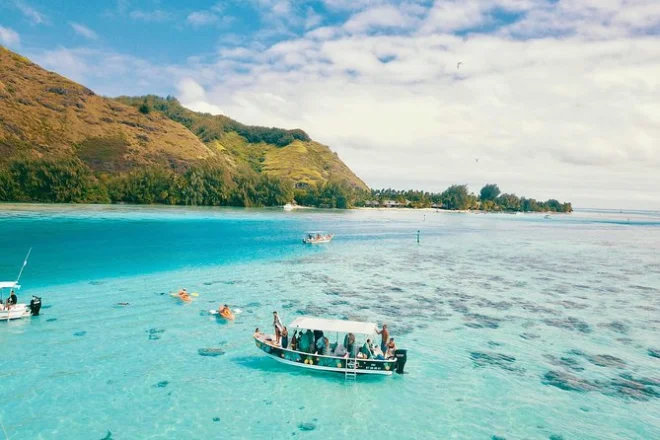 Your day comes with private transportation around Moorea’s lagoon, bottled water to keep you cool under the sun, all snorkeling equipment provided by your guide, plus a snack of cold drinks or lunch served right on a little islet before heading back in.