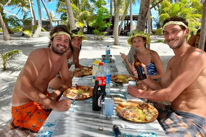 Your day includes hotel pickup anywhere in Rangiroa (or transfer from Ohotu dock if you’re arriving by cruise), all boat rides between lagoons and motus, use of snorkeling equipment so you don’t have to pack your own gear, snacks like fresh coconut bread after swimming stops, a traditional local lunch served right on a private motu under palm trees—with drinks—and finally coffee and cakes by the quiet shores of the secret Green Lagoon before heading back in late afternoon.