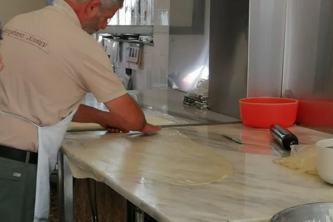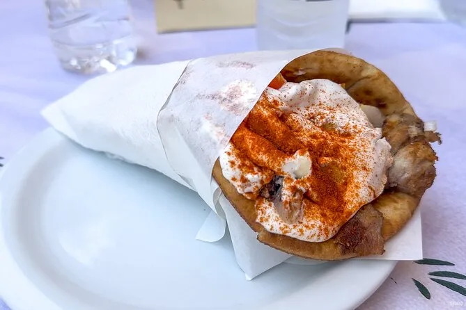 You’ll try bougatsa, local cheeses, olives, Cretan kaltsounia desserts, authentic Greek souvlaki, plus raki and Greek coffee.