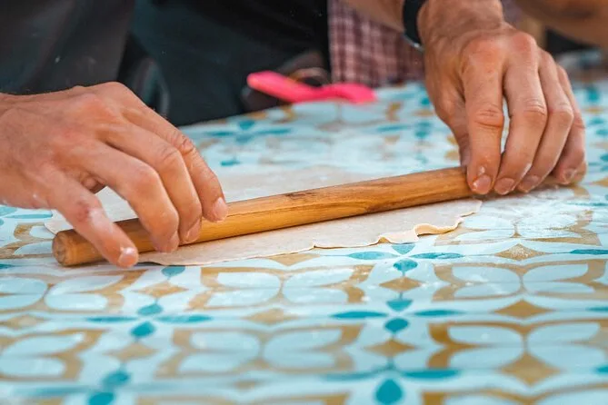 Cooking felt less like a lesson and more like joining in on something they’d do anyway. Maria’s mother showed us how to pinch cheese pies closed (kalitsounia — I’m still not sure mine would pass), and we all crowded around the wood oven while she explained how her grandmother used to bake bread there. There was flour everywhere. Someone put on music, something old and Cretan, and it mixed with the sound of knives on cutting boards and people talking over each other in two languages. The main keyword here is “Cretan cooking class” but honestly it just felt like being part of their family for an afternoon.