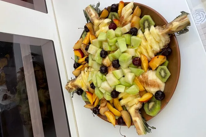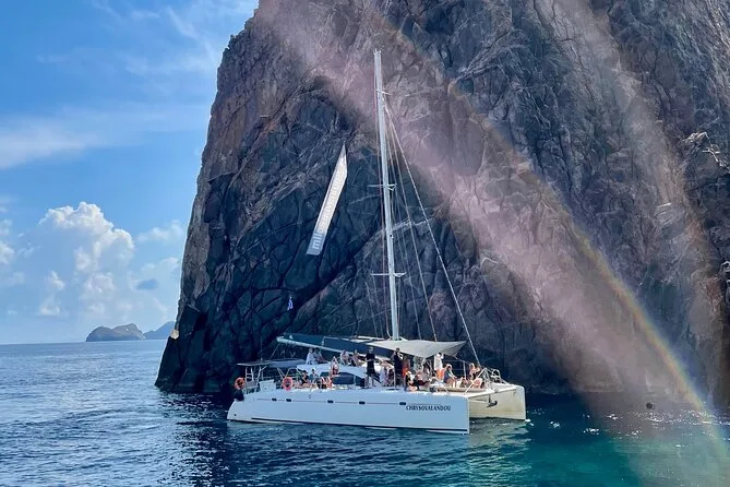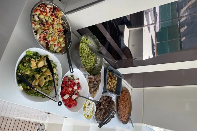 Your day includes light refreshments throughout the sail, a buffet lunch freshly prepared by the crew (with local wine or beer), bottled water whenever you want it, plus snacks and hot drinks like coffee or tea—all while drifting between swim stops before ending at Agia Kiriaki beach.
