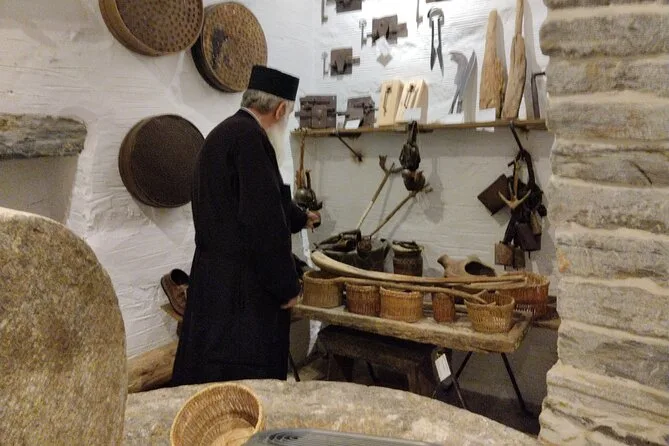 I lost track of time wandering those alleys—bought a little soap from a woman who smiled but said nothing (maybe she didn’t need to). We regrouped for a quick drive past marble quarries near Kinidaros; they’re massive and oddly quiet except for distant clinks echoing off white stone. At Panagia Drosiani church we stopped again—Maria warned us about the steep steps but it was worth it for those faded frescoes inside. Someone lit incense before we entered; I still remember that smell mixing with dust and old stone.