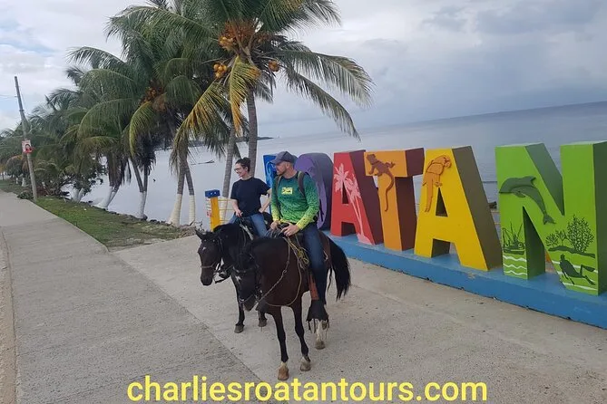 The horseback riding started just outside a small ranch, where a few friendly locals helped us get settled on our horses. Mine was called Luna—she had this habit of flicking her ears back every time I spoke to her. We followed a narrow trail under thick green canopy, sunlight dappling the ground, and every so often you’d hear a distant bird call or catch a whiff of wildflowers mixed with horse sweat. Our guide pointed out a bright green iguana sunning itself on a branch—honestly, I’d have missed it if he hadn’t stopped us. After about half an hour, we reached the water’s edge. Riding right into the shallows was something else—the horses seemed to love it as much as we did, splashing around while we snapped photos by the big Roatan sign.
