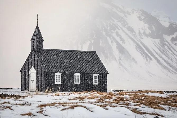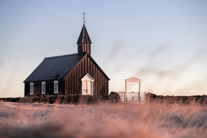 Búðakirkja is a historic black wooden church set against dramatic lava fields and glacier views.