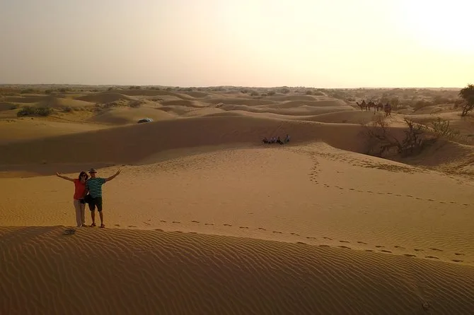 You’ll ride camels across remote Thar Desert landscapes with local guides from Jaisalmer, eat fresh meals cooked over open fire, watch sunset from untouched dunes, and sleep under more stars than you knew existed. Expect laughter, chai breaks, campfire stories—and waking up with sand in your shoes but a grin on your face.