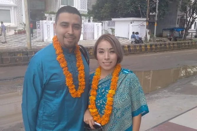 Arriving in Agra felt like stepping into another rhythm. Our guide, Sameer, met us right outside the Taj Mahal gates—he waved so we wouldn’t miss him—and handed us our tickets so we could skip the long line. I didn’t expect to feel much (it’s everywhere in photos), but standing in front of the Taj Mahal with that morning haze softening everything… well, it’s hard not to get quiet for a second. Sameer told stories about Shah Jahan and Mumtaz that made me look at all those marble details differently. He offered to take our photo—he actually crouched down to get “the angle,” which cracked me up.