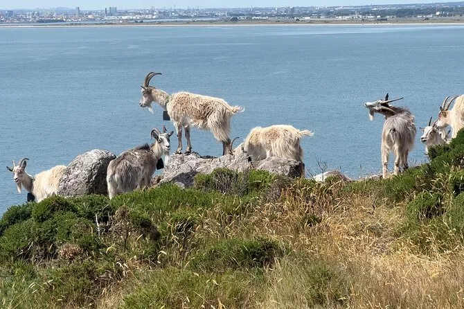 The path around Shielmartin Hill felt like stepping into a different world. Heather brushing my shins, gulls overhead, and that salty-whatever-it-is smell you only get near the sea. Brian pointed out some old Irish goats munching on gorse — apparently they’re kind of famous here. Someone tried to get close for a photo but slipped (no harm done), and we all just cracked up. The cliffs open up suddenly and you see Dublin Bay spread out below, ships crawling toward the port. It’s not quiet exactly — wind in your ears, distant dog barking somewhere down by the beach — but it’s peaceful in its own messy way.