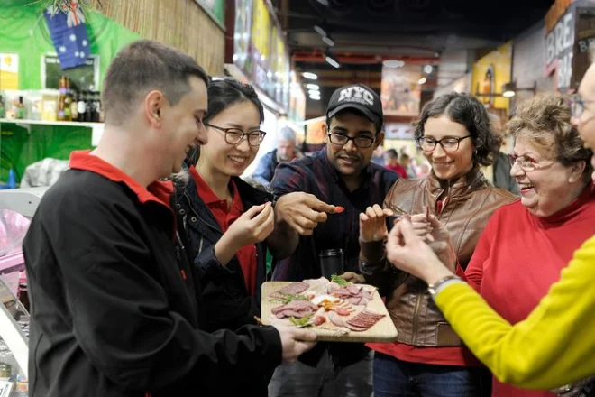 Abbiamo assaggiato così tante cose che ho perso il conto — olive salate che mi hanno fatto desiderare di avere acqua a portata di mano, poi miele con favi così dolce da restare attaccato ai denti. C’è stato un momento in cui Sam ci ha raccontato come le ondate migratorie abbiano plasmato quello che troviamo oggi su questi tavoli. Ha indicato salsicce polacche accanto a erbe vietnamite e ha detto qualcosa tipo “il cibo come una mappa”. Aveva senso in quel caos tipico dei mercati — senti cinque lingue insieme e nessuno si preoccupa se ti fermi troppo su un assaggio. Un venditore ci ha raccontato come la sua famiglia abbia iniziato qui dopo essere arrivata dall’Italia decenni fa. Mi ha offerto una fetta di prosciutto (sottile come carta, quasi si scioglieva) e ha sorriso come se sapesse che era il mio primo vero assaggio.