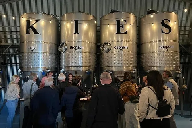 La tappa successiva è stata Kies Family Wines—gestita da una famiglia, con grandi vasche d’acciaio ovunque, ognuna intitolata a un membro del clan. La nostra ospite ci ha versato un bicchiere raccontandoci le storie delle uve come fossero vecchi amici. Di solito non amo molto i rossi, ma il loro Shiraz aveva quel tocco speziato che mi ha sorpreso (in senso positivo). Qualcuno ha chiesto del disegno sull’etichetta e all’improvviso parlavamo di cani di famiglia e artisti locali—sembrava meno una degustazione e più un invito a casa di amici.