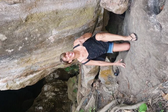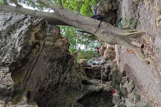 Dopodiché abbiamo percorso stradine strette tra i villaggi—i bambini ci salutavano gridando mentre passavamo—e ci siamo fermati alla grotta di Phnom Chhngok. Mezza nascosta dalle liane, dentro si sta freschi, con la pietra umida sotto le dita. C’è un minuscolo tempio induista del VII secolo proprio nel cuore della grotta; Dara ci ha raccontato storie mentre le nostre voci rimbalzavano sulle pareti. Non mi aspettavo di sentirmi così piccolo lì dentro.