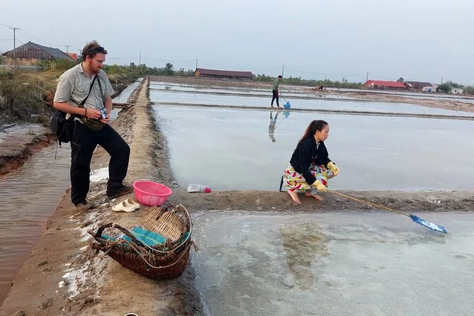 Abbiamo iniziato a Kampot con il signor Dara, che ci ha accolti come vecchi amici, anche se ci eravamo appena conosciuti. Ci ha fatto segno di seguirlo verso le saline prima ancora che potessi prendere un caffè, dicendo che era meglio vederle all’alba. L’aria era pungente e salmastra, e continuavo a strizzare gli occhi per il riflesso del sole su quelle distese bianche infinite. Dara ci ha raccontato come le famiglie lavorano qui stagione dopo stagione; ha indicato una donna che rastrellava il sale in mucchi ordinati, le sue mani si muovevano con un ritmo che non sarei riuscito a imitare nemmeno provando. Lei ha sorriso quando ho fatto ciao (credo abbia trovato buffo il mio cappello).