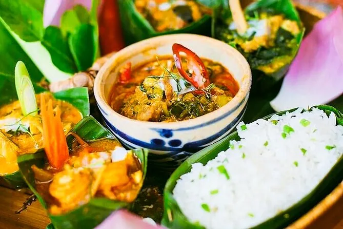 La tua giornata comprende trasporto privato con pickup dall’hotel a Siem Reap, tutte le tasse e ingressi inclusi, acqua fresca al lemongrass o acqua normale all’arrivo, tutti gli ingredienti e gli strumenti necessari per il corso pratico di cucina Khmer guidato da uno chef locale—e infine il pranzo insieme nel tranquillo padiglione del giardino prima di tornare in città.