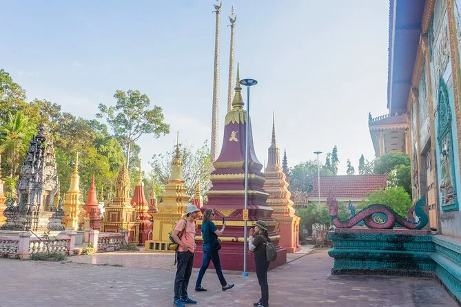 Poi abbiamo visitato un tempio buddista dipinto con colori dorati e rossi sbiaditi. L’aria profumava di incenso e si sentivano i canti dei monaci da qualche parte all’interno. Dara traduceva mentre un monaco anziano ci raccontava storie sulle tradizioni locali e ci ha anche fatto una breve lettura della fortuna in khmer (con tante risate). È stato un momento intimo, come essere ospiti in una casa invece che semplici visitatori.