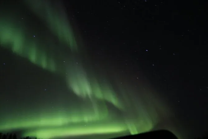 Quella notte ci siamo fermati a tre laghi diversi fuori Yellowknife. Ognuno aveva un’atmosfera diversa — uno con gli alberi raccolti vicino alla riva, un altro aperto e vasto, dove sembrava di vedere all’infinito. A un certo punto qualcuno ha esclamato e tutti abbiamo alzato lo sguardo: eccola, finalmente, quella scia verde che si muoveva sopra il ghiaccio. È strano come tutti si facciano silenziosi in momenti così. Ho scattato una cinquantina di foto mosse col telefono (non serve, lasciate fare a Raj). Al ritorno, i biscotti hanno iniziato a girare tra i passeggeri e qualcuno ha cominciato a canticchiare piano davanti. Ancora penso a quel silenzio sotto un cielo pieno di stelle.