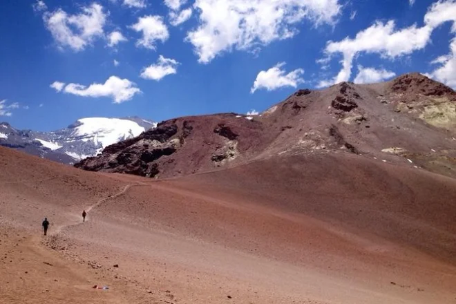 Appena arrivati al punto di partenza del sentiero, ci ha accolto l’aria fresca e quel profumo secco di montagna—quasi metallico. Il percorso sale rapidamente. Abbiamo superato un comprensorio sciistico che in estate sembrava quasi abbandonato, con le seggiovie immobili sopra pendii vuoti. I condor volteggiavano sopra di noi—ombre immense che scivolavano tra le rocce. La guida conosceva ogni cima per nome e ci ha spiegato come il Cerro Pintor abbia quei colori: i minerali nel terreno dipingono striature rosse e gialle sulle pendici.