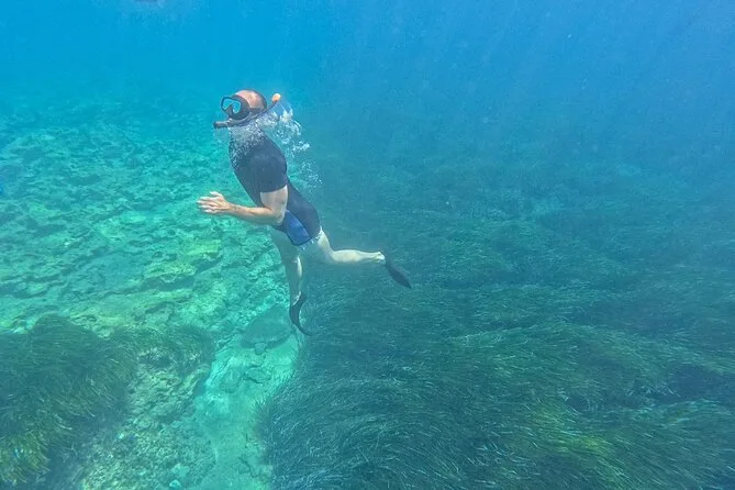 Ci siamo alternati con i sea scooter—ce n’erano abbastanza per far provare tutti—e tra un tuffo e l’altro ci siamo rilassati galleggiando sulle “noodle” o guardando i pesci sfrecciare intorno. Qualcuno ha provato a dire “tartaruga” in greco e ha fatto una figuraccia divertentissima; Maria ha riso così tanto da rischiare di perdere la maschera. A bordo ci aspettava della frutta fresca e dell’acqua, che dopo tutto quel sale aveva un sapore incredibile. Le foto gratuite con le tartarughe sono venute davvero bene—ne ho una in cui sembra che sto per fare un cinque a Ercole (lui ovviamente ha ignorato).