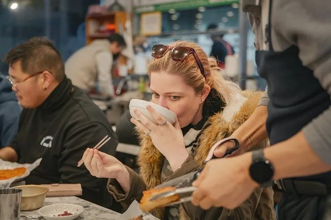 Dopodiché siamo saliti su un van (per fortuna, i miei piedi già protestavano) per la tappa successiva: il mercato Gwangjang. È un caos bellissimo: voci che si sovrappongono ai sfrigolii delle padelle, risate dai tavoli pieni di gente del posto, vapore che si alza ovunque. Abbiamo iniziato con il makgeolli — un vino di riso torbido che sa molto meglio di come sembra — poi abbiamo assaggiato i pancake jeon, croccanti ai bordi. Minji ci ha sfidato a provare il polpo vivo; io ho esitato ma alla fine l’ho fatto (è più gommoso di quanto pensassi). C’era anche la carne cruda, che può sembrare strana ma è davvero buona se non ci pensi troppo. Ci ha mostrato come saltare la fila per i kkwabaegi — ciambelle morbide e calde, con zucchero alla cannella che si attaccava alle dita. Qualcuno ha rovesciato il makgeolli sulla manica e ha solo riso.