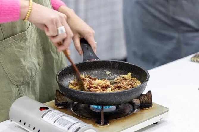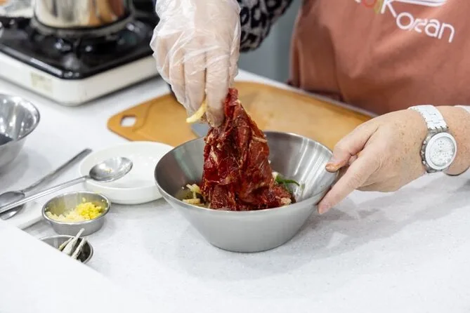 Il laboratorio di cucina era a pochi minuti a piedi, nascosto sopra una panetteria da cui arrivava il profumo dolce del pane. Ognuno aveva il suo tavolo — niente lotte per lo spazio o i fornelli, cosa che ho apprezzato in segreto. Abbiamo iniziato con il bulgogi, tagliando la carne sottilissima e mescolando salsa di soia con quello che sembrava metà del mercato in aglio. Le mie mani hanno continuato a profumare di olio di sesamo per ore. Jomin ha mantenuto tutto rilassato; ci ha raccontato di sua nonna che preparava il bibimbap per il Capodanno lunare mentre mescolavamo riso e verdure. Ho provato a dire “jeyuk bokkeum” in coreano — un disastro totale — ma a nessuno è importato.