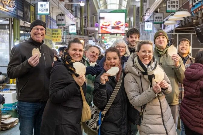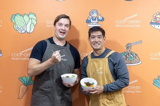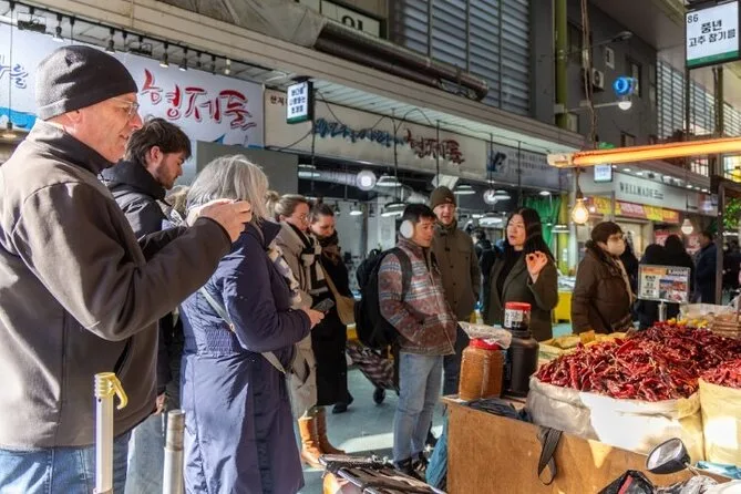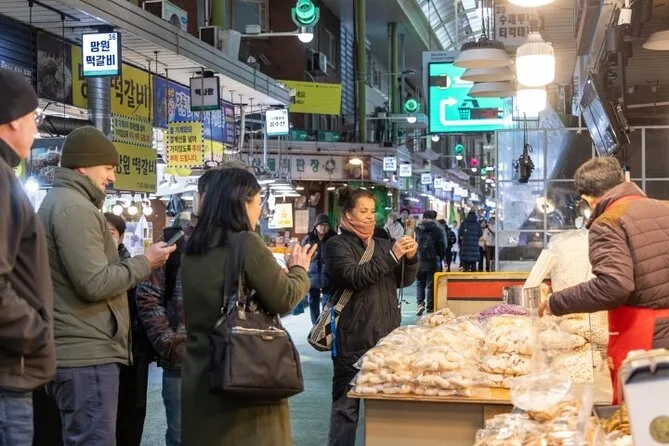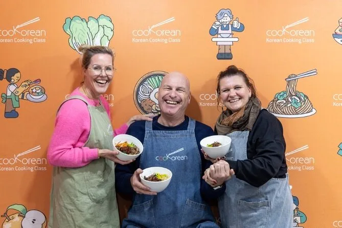 La tua giornata include l’incontro con la guida locale alla stazione Mangwon per un vivace tour del mercato con assaggi di street food, seguito da una lezione in uno studio vicino dove avrai il tuo tavolo e ingredienti freschi per preparare tre piatti coreani classici — più acqua, vino di riso fatto in casa, dessert e un ricettario professionale da portare a casa.