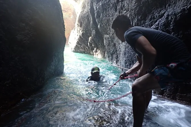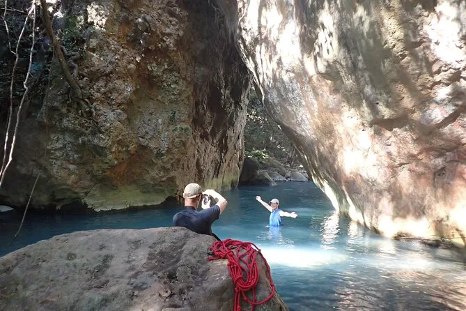 La parte finale è quella che mi è rimasta impressa: tirarmi su attraverso uno stretto passaggio in una grotta con l’acqua che mi arrivava alle ginocchia. Si è fatto buio in fretta—qualcuno dietro di me ha scherzato sui pipistrelli—e poi eccola lì: la cascata La Leona che si getta tra pareti di canyon così blu da sembrare irreale. Siamo rimasti fermi un attimo in silenzio, perché cosa si può dire? Il cuore batteva forte ma dentro mi sentivo stranamente calmo. Ancora oggi penso a quella luce che si rifletteva sulla schiuma.