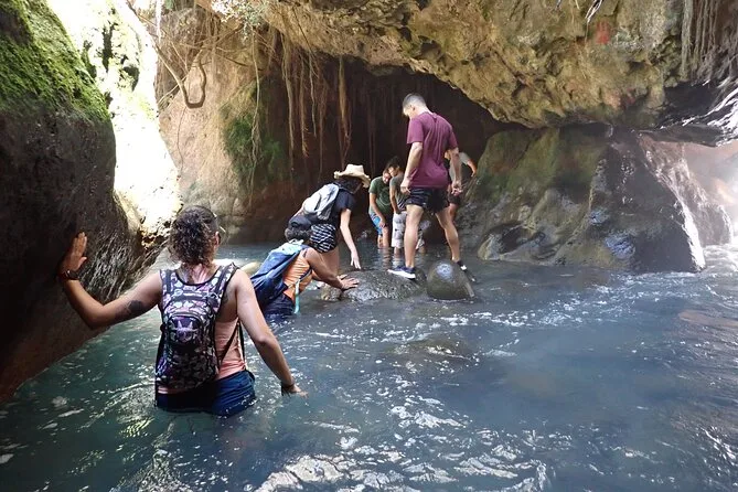 Partirai da Curubandé lungo il fiume Blanco con una guida locale, attraversando ruscelli e arrampicandoti su rocce fino all’ingresso nascosto della grotta della cascata La Leona. Preparati a acqua fredda, risate (spesso su te stesso) e momenti in cui la natura ti lascia senza parole.