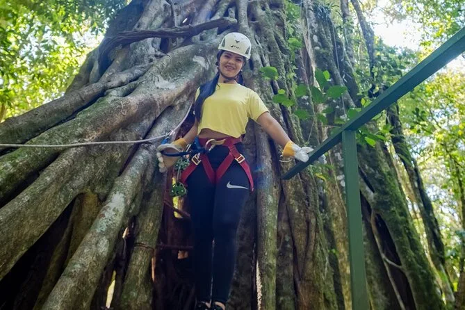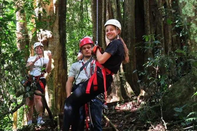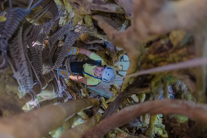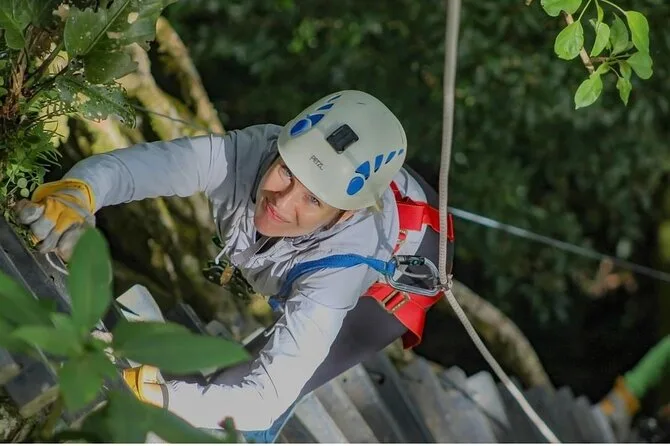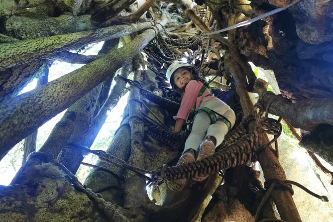 Il tour include zipline nella chioma degli alberi, discesa in corda doppia di 45 metri fino al suolo, arrampicata dentro un albero cavo con una scala e un finale con lo swing Tarzan.
