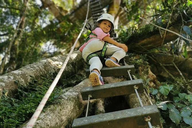 Risalgere dentro quell’albero cavo è stato stranamente magico — il legno umido sotto le mani, la luce che filtrava da piccoli buchi sopra. Dentro si sentiva un profumo dolce, quasi di foglie vecchie o tè. Dietro di me qualcuno ha iniziato a cantare piano in spagnolo (non avevo idea di quale canzone fosse), e tutti hanno riso quando si sono bloccati su una parola. E poi sei di nuovo in cima, col cuore che batte forte, pronto per l’ultimo swing Tarzan. Onestamente? Ho urlato più forte di tutti.