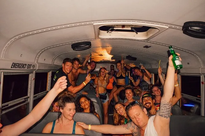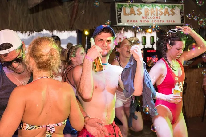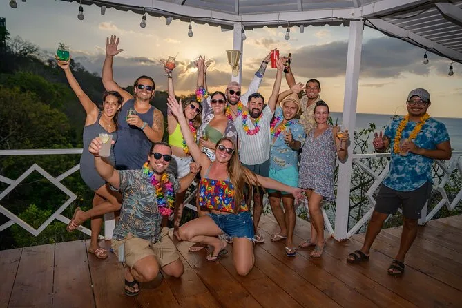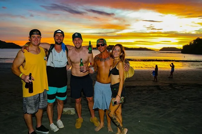 Il tuo giorno include una guida locale che ti accompagna da Tamarindo a bordo di un party bus con intrattenimento dal vivo, drink di benvenuto a ogni fermata (sì, anche gli shot), sconti happy hour su cibo e bevande lungo il percorso, più un grande falò in spiaggia al tramonto prima del ritorno serale. Le tasse locali sono incluse — porta solo la tua energia (e magari un po’ di crema solare).