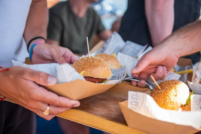 Nečujam è tranquilla, si sente solo il rumore dell’acqua che batte sullo scafo. Mi tuffo prima di pensare troppo al freddo—in realtà, una volta in movimento, non è poi così male. Qualcuno mi passa un salvagente gonfiabile (non sono un nuotatore esperto) e galleggiamo osservando piccoli pesci che si nascondono tra le rocce. Tornati a bordo, il pranzo è semplice: hamburger (io scelgo tonno) con patatine, e vino se vuoi dopo l’una. Mangiare all’aperto con i capelli bagnati e la pelle salata rende tutto più buono di quanto dovrebbe. C’è un momento in cui restiamo tutti in silenzio a masticare, guardando l’isola di Šolta avvicinarsi lentamente.